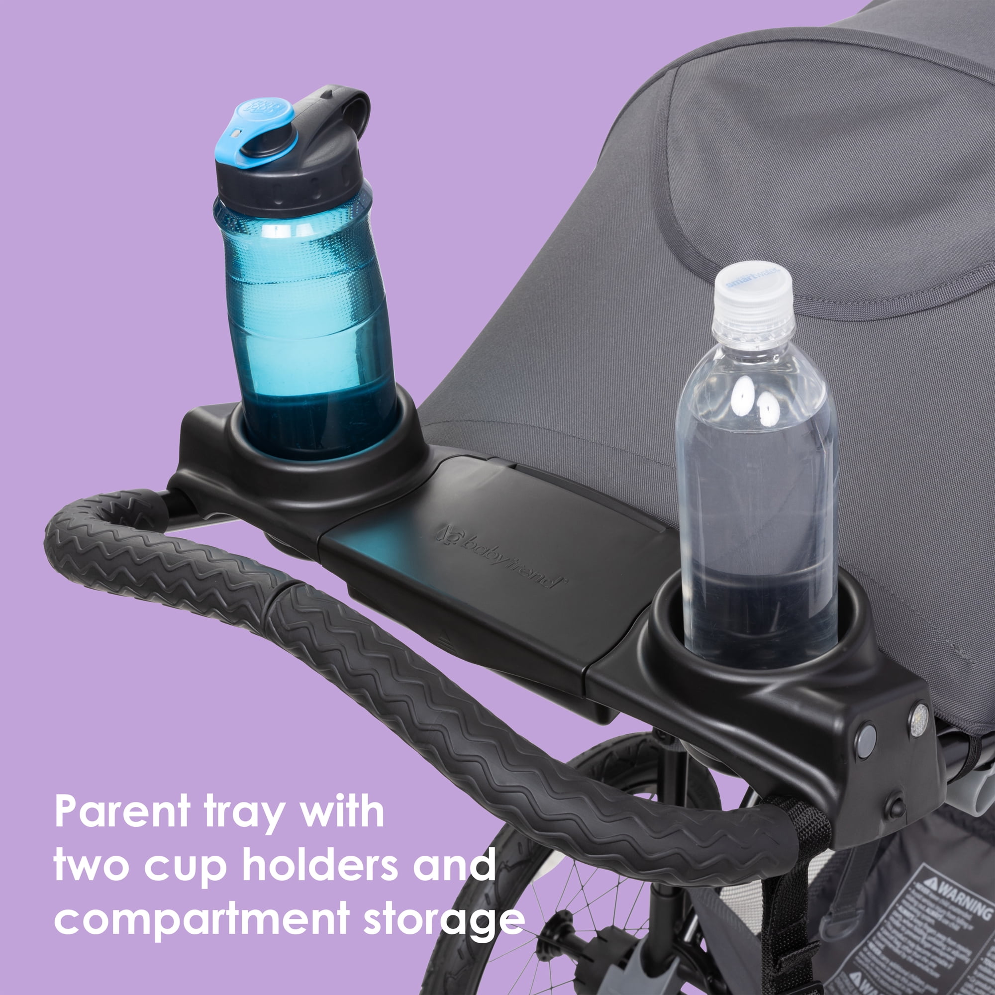 The Baby Trend® Expedition® Zero Flat Jogger Travel System with LED Lights is designed with style and security for you and your child. The innovative Zero Flat Tires will never go flat, allowing the tires to stay inflated for the life of your jogger. For added safety, the LED lights installed on parent tray illuminate stroller during walks at sundown. It has a parent tray with 2 cup holders and covered storage compartment and an extra-wide ergonomically shaped rubber grip for comfortable handling. The child’s tray has 2 cup holders to keep beverages and snacks handy for your little one. The jogger also includes a 5-point harness and a rotating canopy with visor that can be adjusted to shield your child from the elements. It has a convenient storage basket under the seat, offering ample space to carry feeding bottles or other baby essentials. The stroller easily folds into a compact unit for easy storage. Its front wheel swivels for easy maneuvering. The wheel can also be locked to offer in-line performance. This travel system includes the all-new EZ-Lift Infant Car Seat with the integrated Side Grip handle for ergonomic carrying.