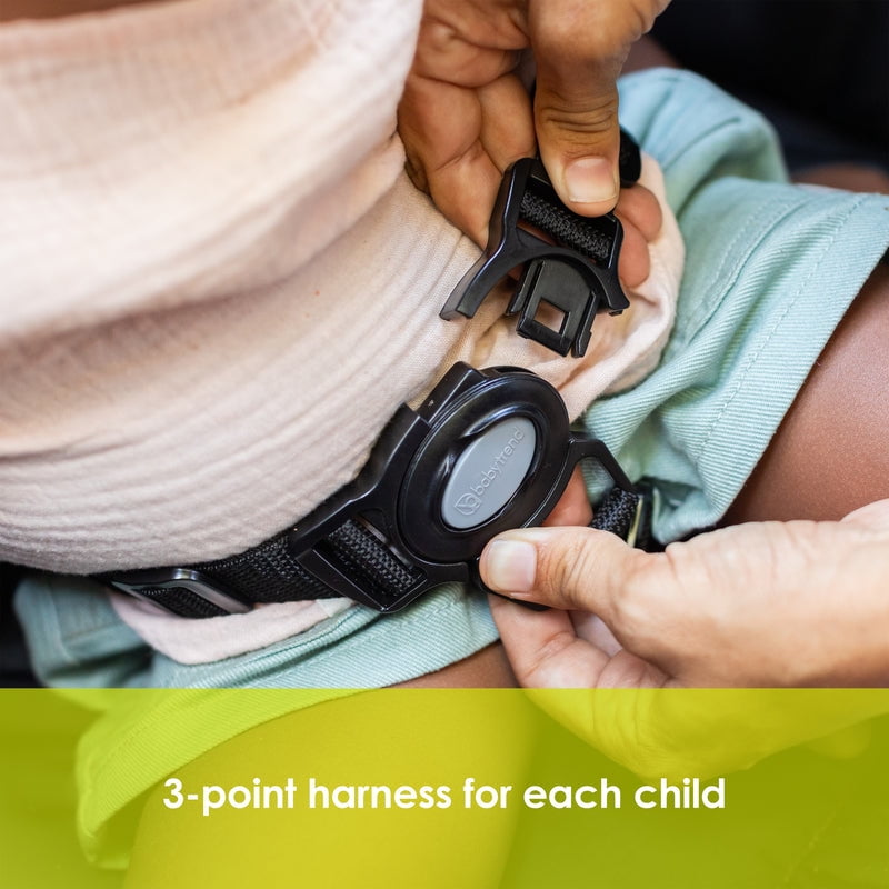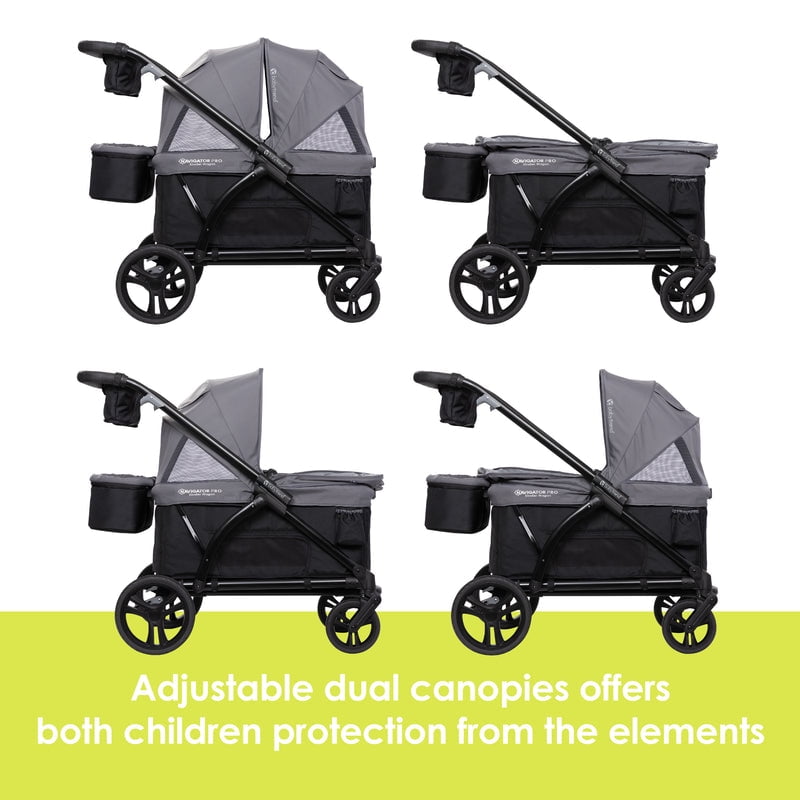The Navigator PRO 2-in-1 Stroller Wagon is the new and improved wagon option from Baby Trend to fit your family’s unique needs! The large cargo space offers built-in seating for two and includes two 3-point safety harness belts to keep your little ones secure. The dual canopies are independent and will shield both children from environmental stressors, such as the sun. Both canopies are adjustable and can be easily removed when not in use. Little ones will enjoy the extra support with the versatile Seat2Mat – 2 seat pads that fold down to convert into a mat. The durable frame is dependable and will be a trusted addition to all family outings. The wagon’s hide-away pull handle is adjustable and offers a pull wagon option. The stroller handle can be used when in push stroller mode. The stroller handle also includes a parent tray with two cupholders and a center console for added storage. A flip over basket can easily be attached to the front or rear of the wagon, adding even more storage capabilities. The child tray allows you to easily keep snacks close by with two cup holders and center consoles for each child. Easy one-press removable and durable all-terrain wheels with suspension and easy push brakes allows for a smooth ride wherever life may take you. This stroller wagon can hold up to 110 lb and is ideal for babies who can sit up unassisted, toddlers and young children.