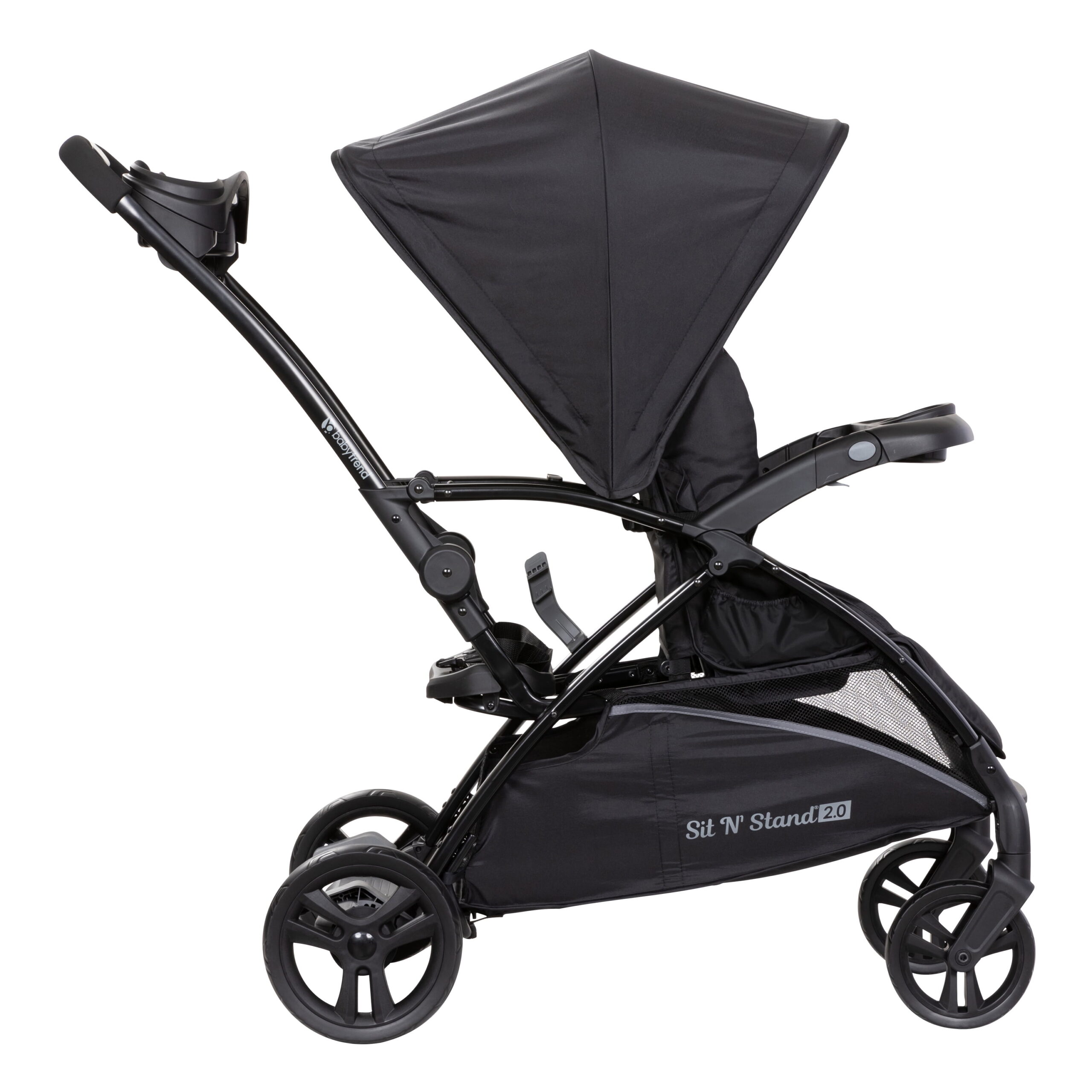 The Baby Trend® Sit N’ Stand® 5-in-1 Shopper Stroller is perfect for your growing family. With the lightweight and streamlined frame, our Sit N’ Stand® 5-in-1 Shopper Stroller has 5 modes of use – travel system mode, car seat in the front seat and older child standing on platform, child in the stroller seat only, child in the stroller seat with sibling sitting on bench, and child in the stroller seat with sibling standing. The front and back seats can hold kids up to 50lbs each. Your child will be comfortable and at ease with the stroller’s premium fabrics and padding. Not only will your children love it, but you will also love this stroller with the included parent console with a cell phone positioner and extra-deep cup holders! When not in use, this stroller offers a hassle-free self-standing fold. This stroller is compatible with Baby Trend infant car seats to form a travel system.