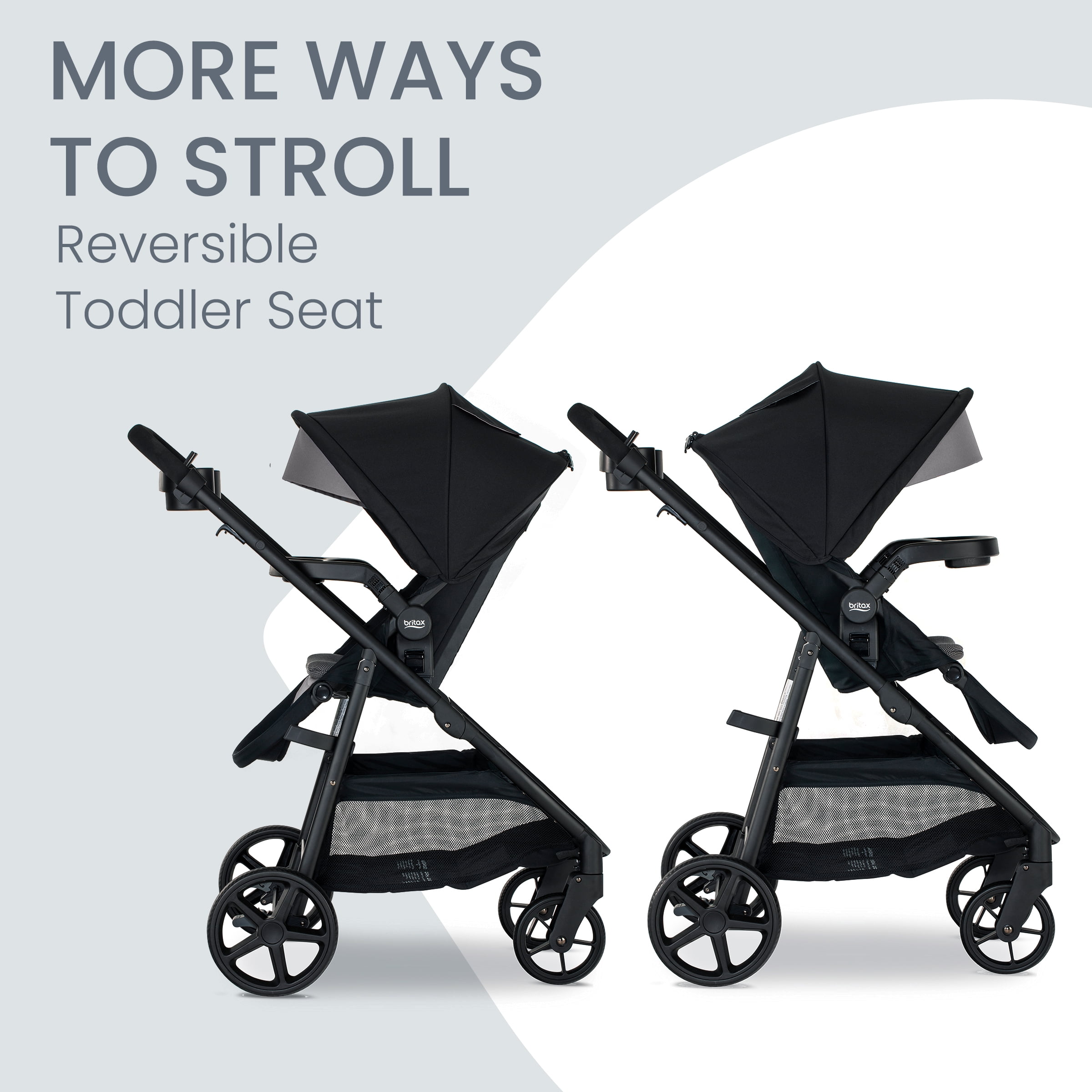 Find your own pace as a parent with the Britax Brook+ Baby Stroller. This toddler stroller features bold neutral fashion options to suit your personal style. Featuring an ultra-lightweight frame and large cargo basket, this portable stroller provides easy transportation without sacrificing durability or storage space. The Brook+ travel stroller offers four ways to stroll with a reversible toddler seat that can easily switch from parent-facing to forward-facing and can pair with select Britax and competitive infant car seats (sold separately). The one-step fold lets you pack up this compact stroller and go with trunk space to spare. This Britax stroller also comes with a UPF 50+ water-resistant canopy with a flip-down sunshade, a parent tray with 2 cup holders and a phone holder and a child snack tray for added convenience. The SafeWash seat insert is washer and dryer safe and the easy-adjust harness allows for simple adjustments as your child grows.