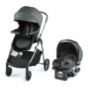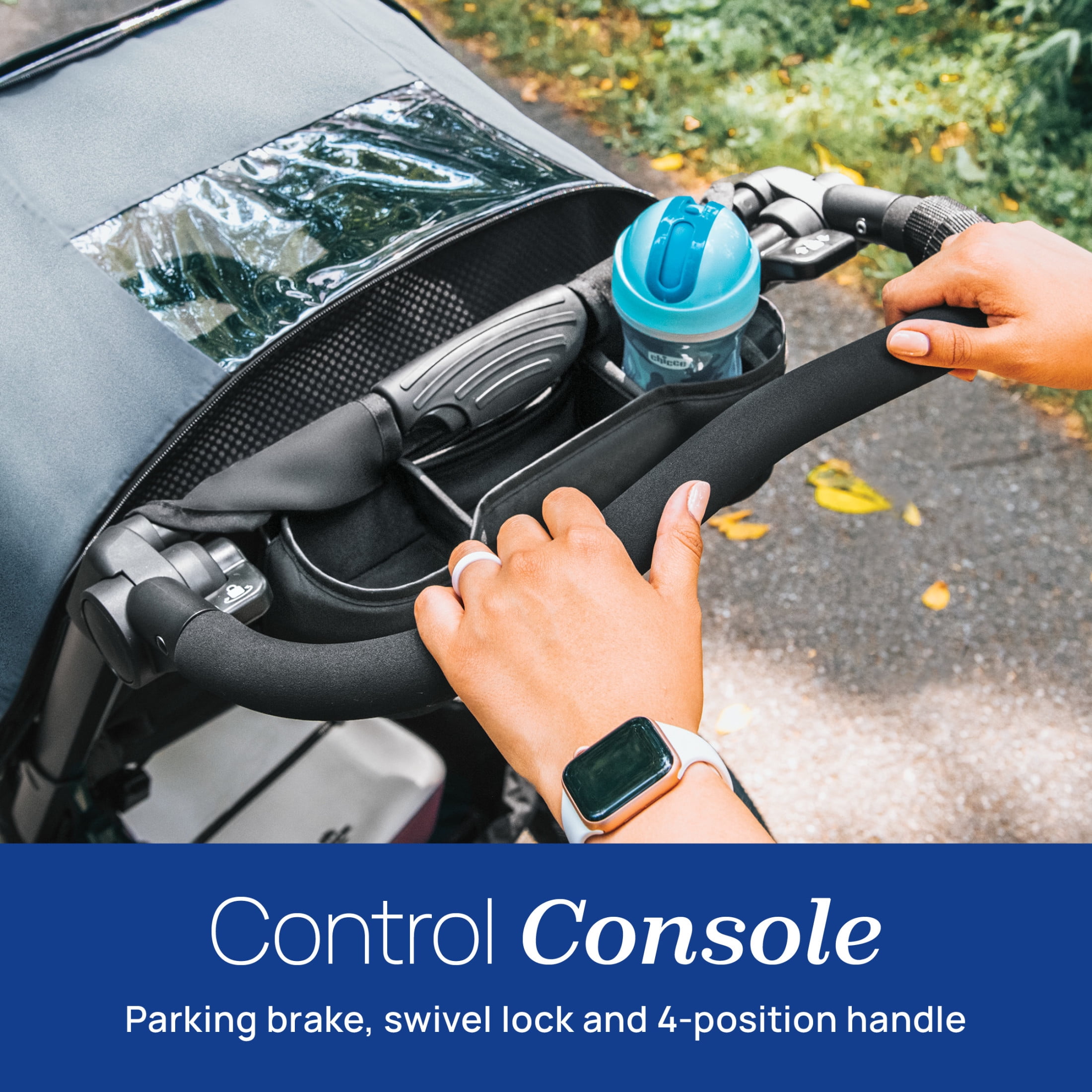 The exclusive Control Console includes hand-operated parking brake to keep foot area clear and unobstructed, hand-operated locking front swivel wheel for on-the-go adjustment and 4-position handle. A height-adjustable padded handle, soft parent tray with two cup holders and large storage basket accessible from the front and back of stroller provide added convenience.