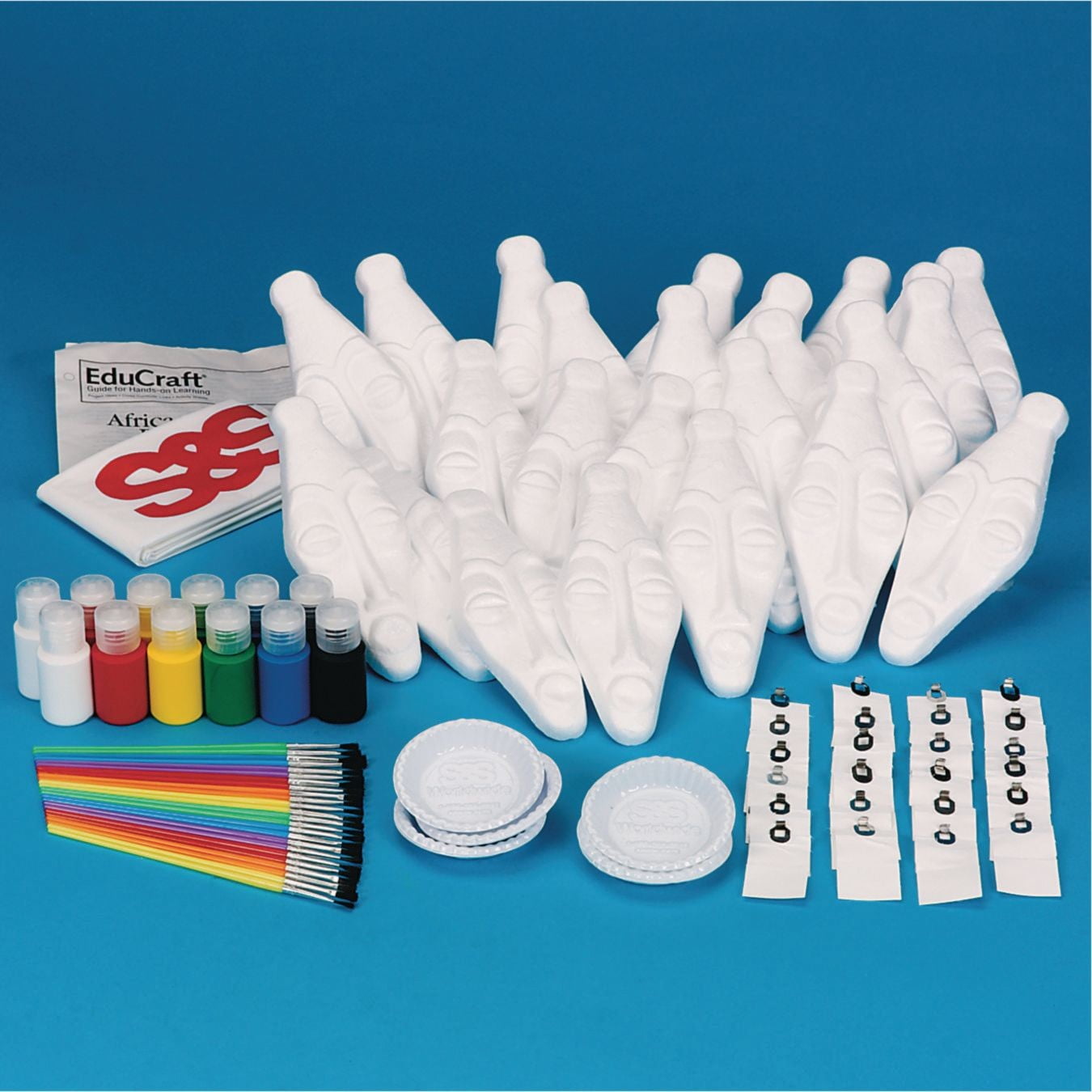 Smooth, white craft foam masks with full detail are ready to paint while you introduce African culture to your kids. Includes 12 each of 2 mask styles, non-toxic acrylic paint, brushes, hangers and a FREE EduCraft® Guide with instructions and activities. 7″H x 2-3/4″W.