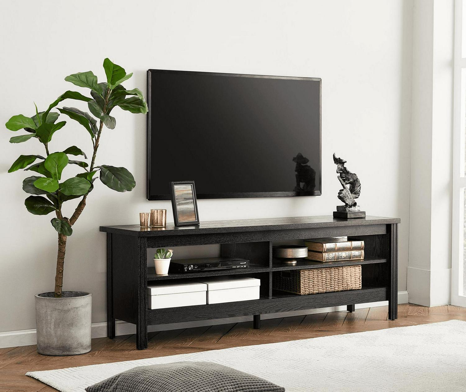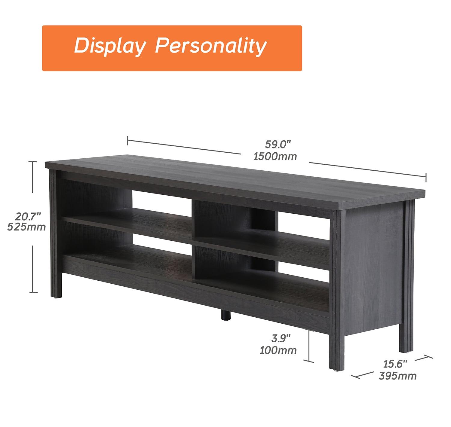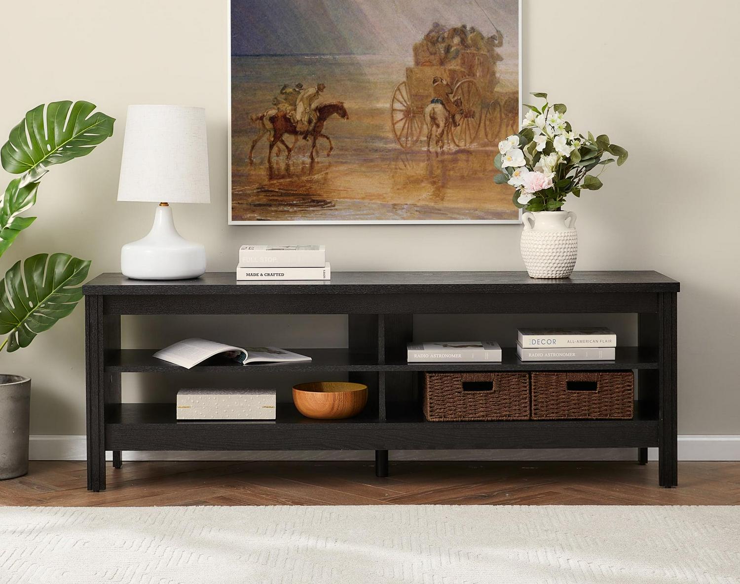The black wood grain and simple lines on this tv stand make it look classic and elegant. It can be not only used as televison stands, also perfect for sofa table, entertainment center, media stand, storage console table, tv console etc. This TV stand is perfect for TVs up to 65 inch TV.4 open shelves with big capacity allow you to storage the books, magazines, CDs and any other media or gaming devices. The media console table made of high quality MDF which is durable and sturdy enough to be used for a long time. Plus, four wooden legs further enhance stability, preventing the TV stand from wobbling. Max load capacity: 175 lbs. The black entertainmen center for 65 inch tv with smooth surface is waterproof and easy to keep clean with a damp cloth. The tv table is 3.9 in high height off the ground which adequate for robot vacuum cleaner can passing freely. No more headaches from dust under the cabinet.
