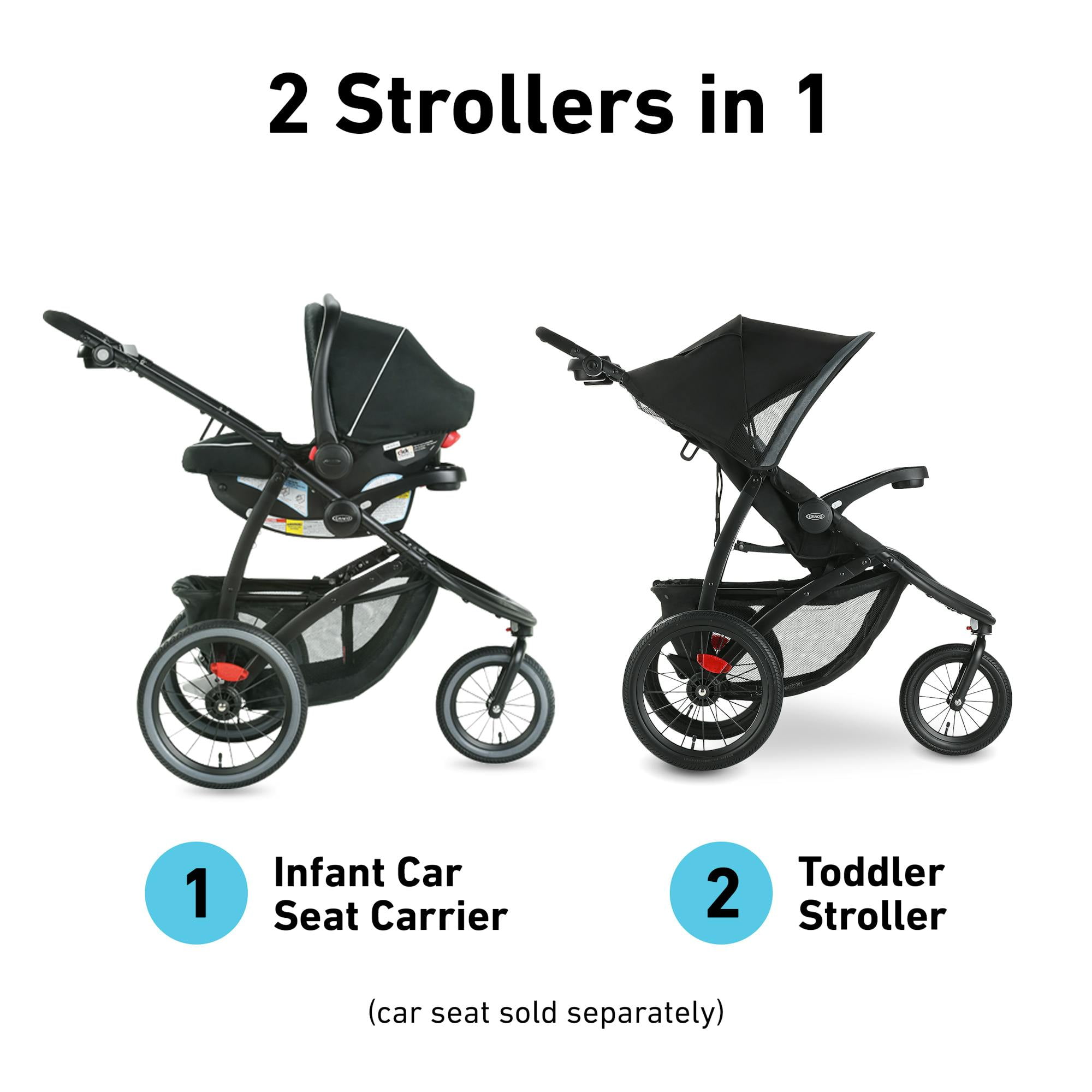 The Graco FastAction Jogger LX features a one-second, one-hand fold, giving ultimate convenience to parents on the go. This crossover stroller combines all the comfort and convenience features of a traditional jogging stroller, while being compact and easy to fold. The jogger stroller has a removable seat pad that converts the stroller into a lightweight infant car-seat carrier. The FastAction Jogger LX is loaded with plenty of features, including a child’s tray, parent’s tray, and height-adjustable handle. Click Connect technology allows for a one-step, secure connection of infant car seat to stroller.