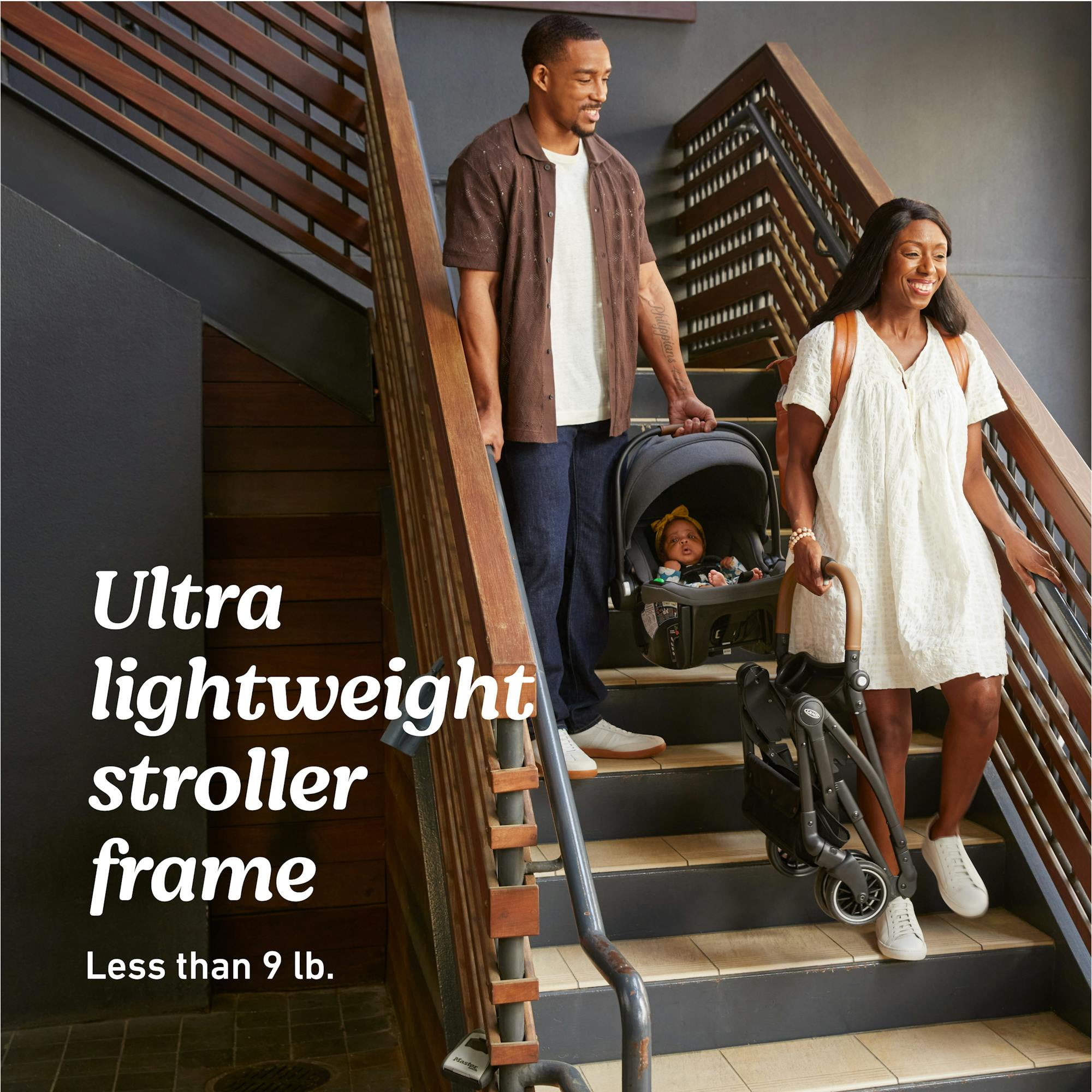 The Graco GoMax Compact Stroller Frame simplifies your life on the go by pairing with your infant car seat to create a super portable travel solution! Seamlessly pair your GoMax stroller with the Graco GoMax Insta-Install infant car seat or any Graco SnugRide infant car seat to create your own travel system (infant car seat sold separately). This incredibly lightweight stroller frame features a one-hand, ultra-compact fold that easily stores anywhere! It’s also overhead friendly* to make air travel easy. A height-adjustable handlebar and front-wheel suspension help provide a comfy ride for both you and baby. The large, easy-access storage basket has room for baby and parent essentials.