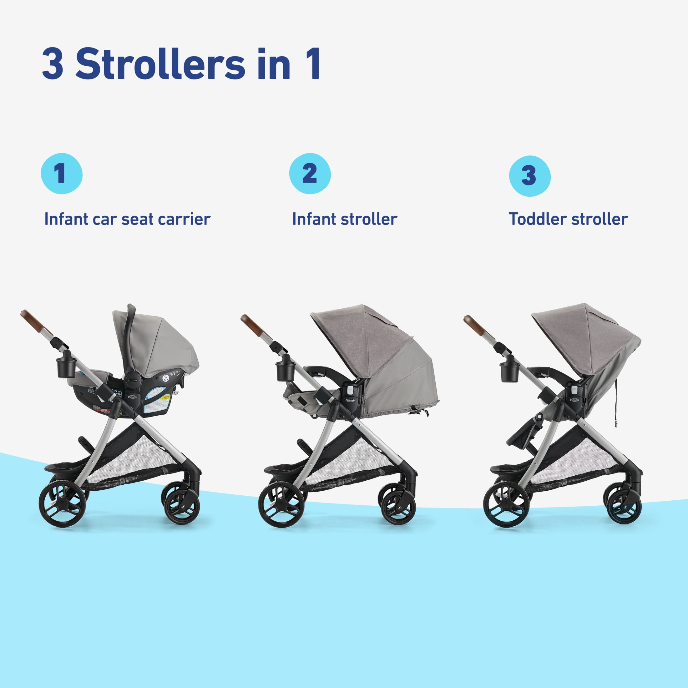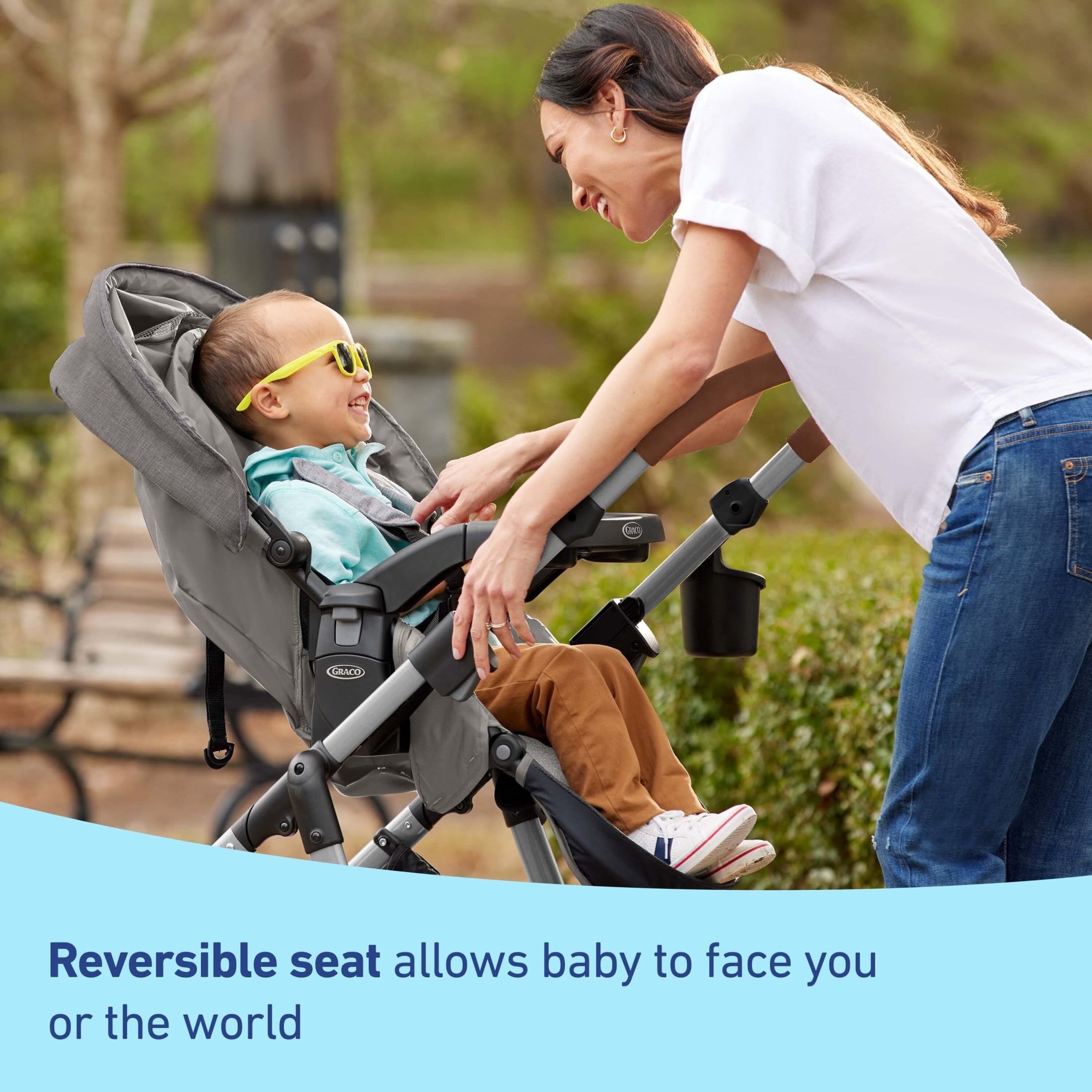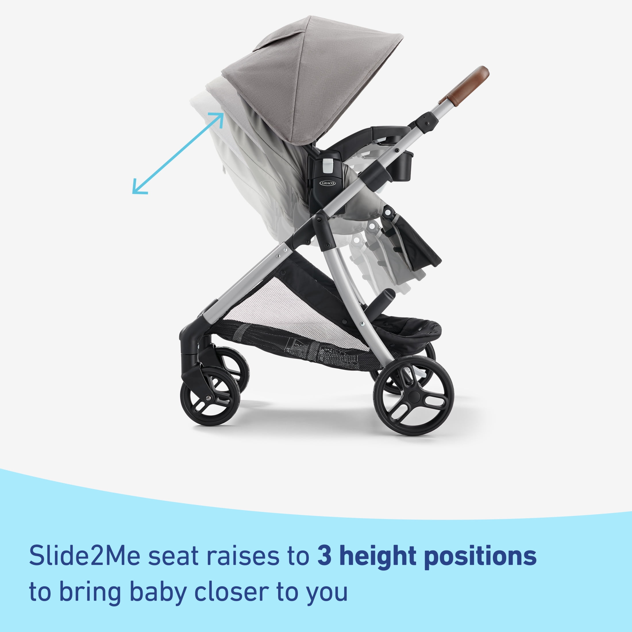 Bring baby closer with the Graco Modes Closer Travel System, featuring the Slide2Me height-adjustable seat, which can easily be adjusted to 3 height positions to share precious moments on everyday strolls. This 3-in-1 stroller is an infant car seat carrier, an infant stroller, and a toddler stroller, and comes with the SnugRide Lite LX Infant Car Seat to help protect rear-facing infants 4-30 lb and up to 32″. The reversible seat allows baby to face you or the world for just the right ride. Assembly and storage is easy with the quick-release wheels and one-step brake. The one-step fold allows for simple storage and transportation. We kept comfort in mind for both you and your child: the removable child’s tray with cup holders and parent cup holder let you both keep drinks within reach while on the go. Plus, the multi-position reclining seat and adjustable calf support make for a more comfortable ride for your little one.