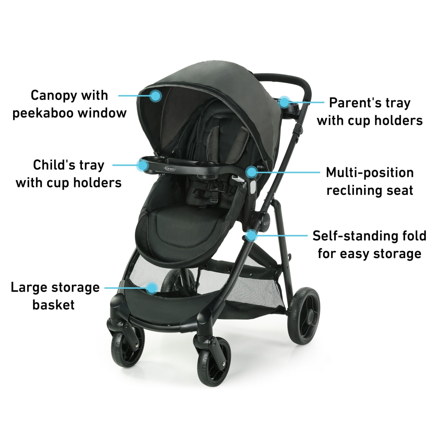 The Graco Modes Element Travel System is the 3-in-1 stroller with room for all of baby’s essentials. It converts from Infant Car Seat Carrier to Infant Stroller to Toddler Stroller for a versatile ride from infant to toddler. For even more riding options, baby can ride parent-facing or forward-facing thanks to a reversible stroller seat. The travel system includes the Graco SnugRide Lite LX Infant Car Seat, rear-facing from 4-30 lb, for seamless transition from car to stroller. With Modes Element Travel System, you can take your necessities with you—a parent’s tray with cup holders and removable child’s tray with cup holders keep drinks and snacks at hand. A large storage basket holds child and parent essentials so you can stroll with everything you need. And whether you’re traveling or home for the day, a self-standing stroller fold ensures easy storage.