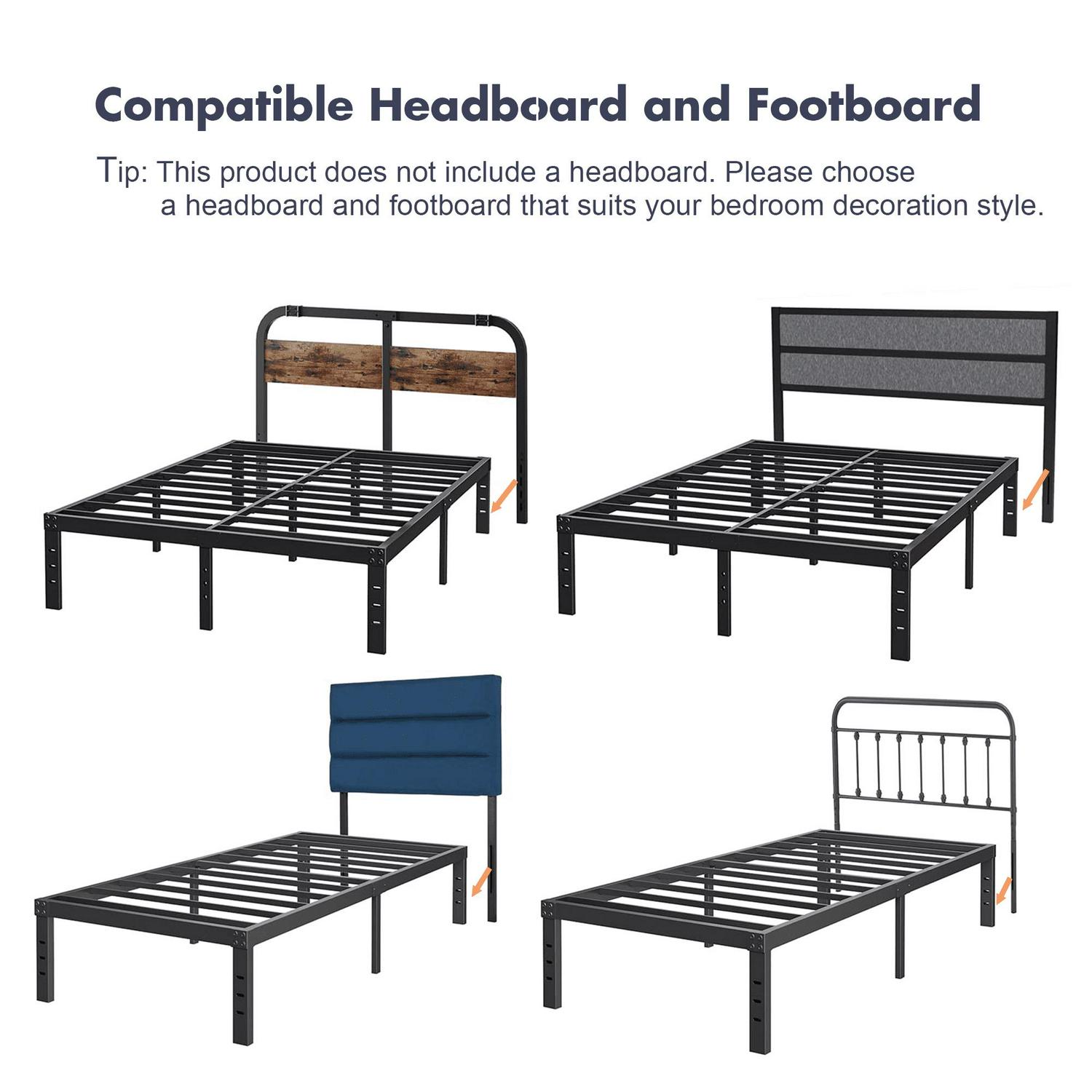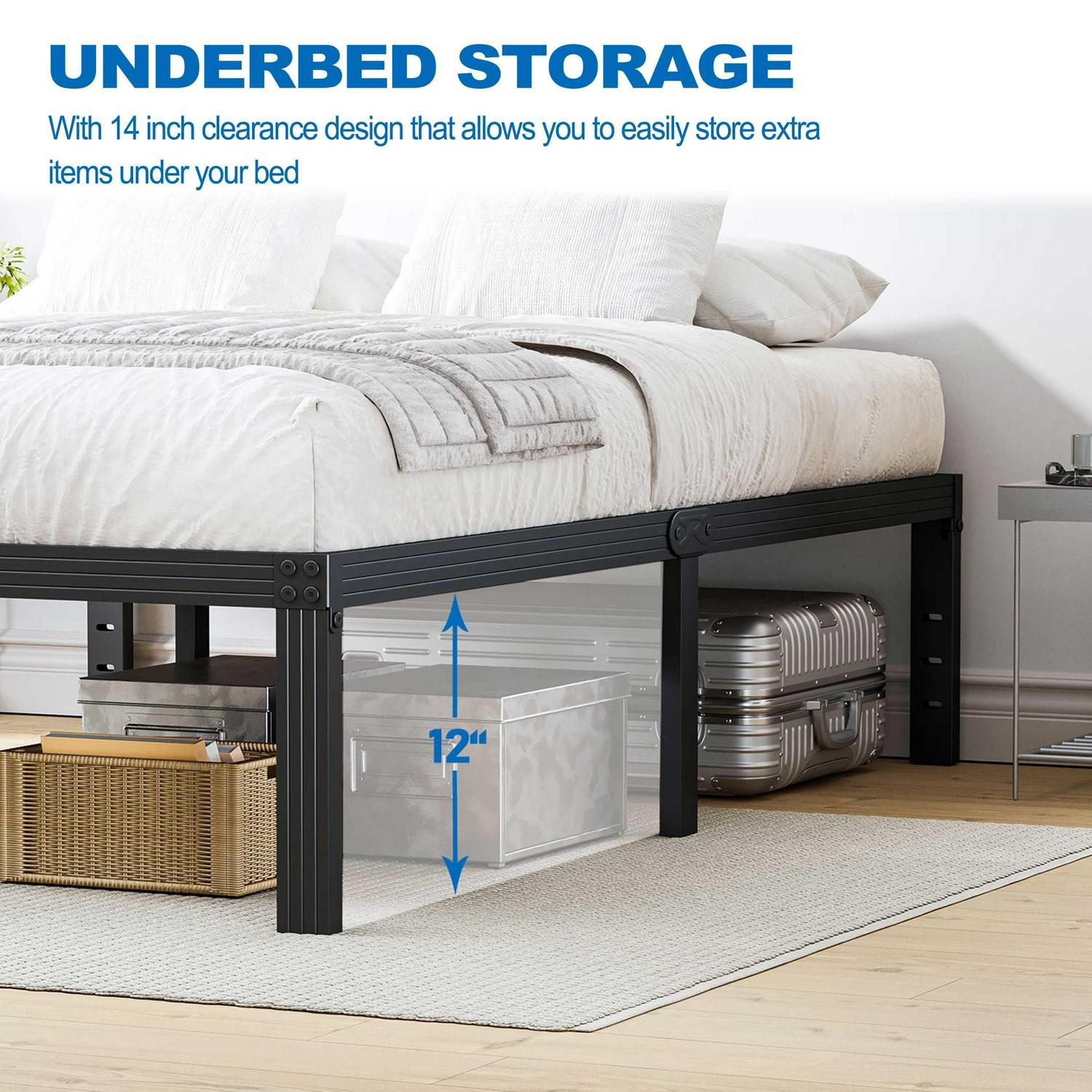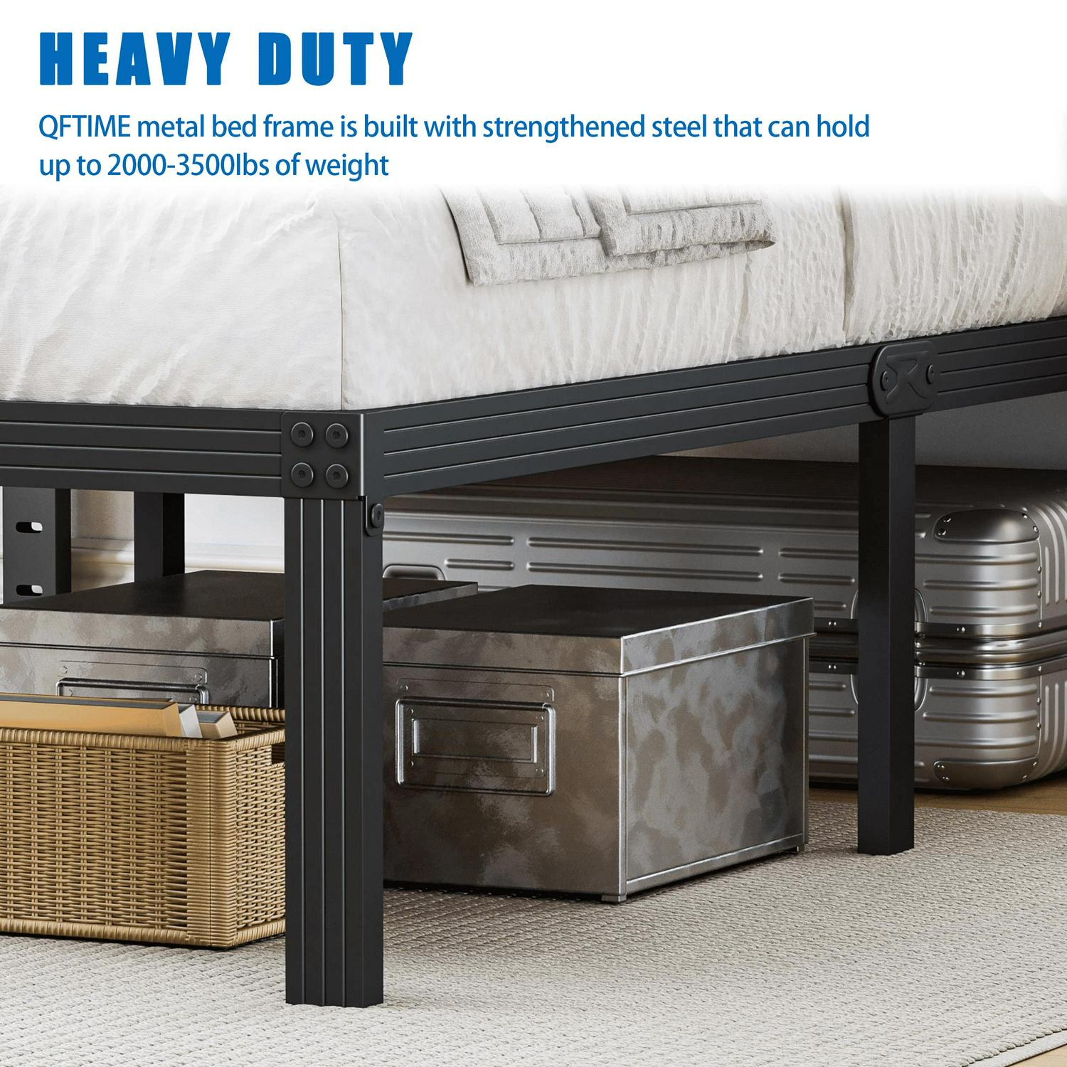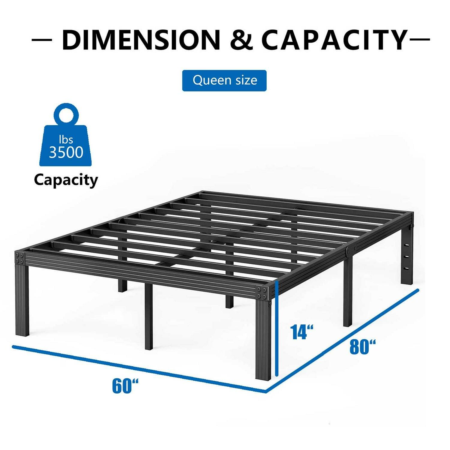 QFTIME is a brand that focus on creating a non-slip and noise-free bed frame to provide you a better sleeping time,which ideal in your master bedroom, guest bedroom or teen s room. This black 14 inch bed frame with upgraded steel slats provide a stable and secure support environment, the pressure of the whole frame bears up to 3500 lbs, fully meets the daily use of family. Another feature is the 12 inches of under bed storage space to keep those needed items conveniently stored away. For added convenience, there’s no box spring needed. Let s enjoy a good night’s sleep on our durable and noise-free platform bed frame.