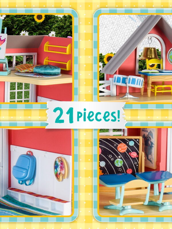 Honey Bee Acres Sunshine Meadow School – 21 Piece Miniature Dollhouse with Accessories & Exclusive Fox Figure – Pretend Play Set for Kids Ages 3+